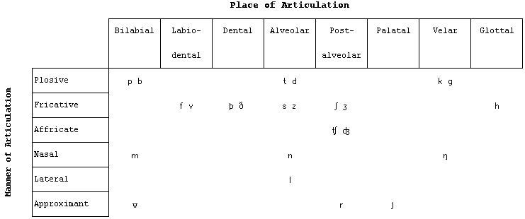 The following table from Roach (p. 65) classifies the English consonants according to these features, mapping manner against place of articulation. Where there are two symbols together the left-hand is fortis or unvoiced, and the right is lenis or (generally speaking) voiced.