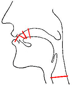 English fricatives have five articulatory positions: These positions are shown in RED.