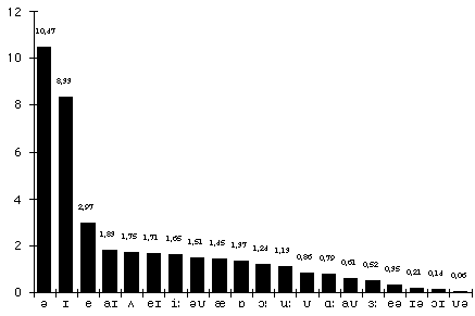 Here are some data from Gimson (1980:149), after Fry (1947). I find these figures striking, to put it mildly. They mean that more than one out of every 10 phonemes in English is schwa, the one sound we have no way of showing in spelling. - Note too that speakers who use